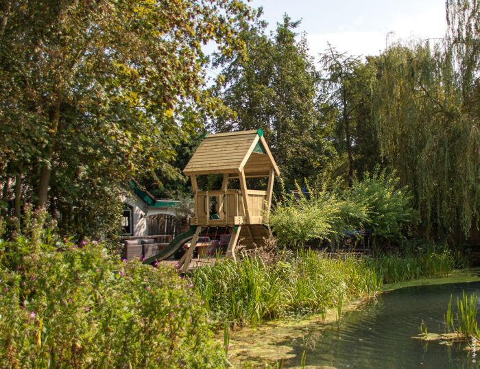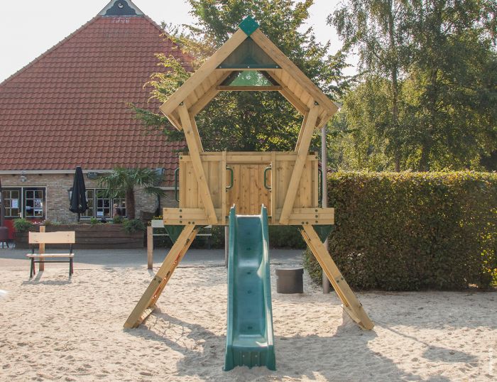 - Tejado a dos aguas con acabado en listones de madera tratada, que proporciona protección óptima contra lluvia y sol